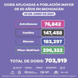 Morelia, Michoacán, a 25 de junio de 2021.- En la entidad se han aplicado un millón 117 mil 943 dosis de vacuna contra COVID-19 a personas mayores de 50 años. De las dosis aplicadas por personal médicos, enfermería y paramédico de la Secretaría de Salud de Michoacán (SSM)...
