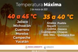 Morelia, Michoacán, 3 de marzo de 2021.- Nuevamente las condiciones climatológicas en gran parte de la entidad estarán dominadas por ambiente caluroso, con temperaturas superiores a los 30 grados y hasta los 40 grados Celsius en zonas de la Tierra Caliente michoacana. Estas condiciones, indica el Servicio Meteorológico...