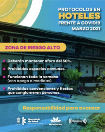 Morelia, Michoacán, a 3 de marzo de 2021.- Con el objetivo de lograr una apertura gradual del sector económico en Michoacán sin desatender las medidas contra el COVID-19, este mes los hoteles deberán cumplir de manera estricta los protocolos emitidos por las autoridades de salud. Estos espacios representan un...