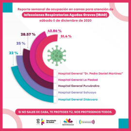 Morelia, Michoacán, a 5 de diciembre de 2020.– Derivado del comportamiento epidemiológico por COVID-19, las camas reconvertidas para la atención de Infecciones Respiratorias Agudas Graves (IRAG), de cinco hospitales de la Secretaría de Salud de Michoacán (SSM), registran una ocupación de entre 51.4 al 22 por ciento El...
