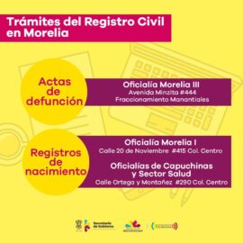 Morelia, Michoacán, 24 de noviembre de 2020.- Para brindar a la población michoacana, servicios oportunos y de calidad, la Secretaría de Gobierno, reitera los horarios que se mantienen en las direcciones de servicio al público durante la epidemia por COVID-19. El Registro Civil, trabaja a través de citas...