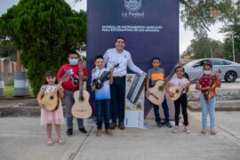 La Piedad , Michoacan a 22 de Julio de 2022. La comunidad Los Melgoza fue testigo de la entrega de instrumentos musicales que realizó el presidente municipal de Samuel Hidalgo, a los niños de la Escuela Primaria Francisco I Madero, mismos que integran la estudiantina de la...