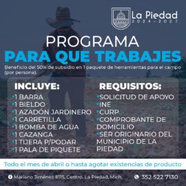 La Piedad, Morelia, Michoacán, 4 de abril de 2025.- El impulso para el mejoramiento del campo sigue siendo una prioridad para el Gobierno Municipal de La Piedad encabezado por Samuel Hidalgo, quien a través de la Dirección de Fomento Agropecuario, está promoviendo programas que los beneficien. Dentro...