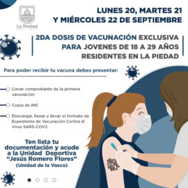 La Piedad, Michoacán a 15 de Septiembre del 2021.- La jornada de vacunación para personas de 18 a 29 años iniciará el próximo lunes 20 en las instalaciones de la Unidad Deportiva “J. Jesús Romero Flores”, de la colonia Vasco de Quiroga, así lo dieron a conocer autoridades...