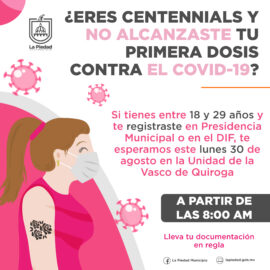 La Piedad, Michoacán; a 27 de agosto del 2021.- Para todos los Centennials en edad de 18 a 29 años que no alcanzaron vacuna en las fechas programadas, el Gobierno Municipal en coordinación con la Secretaría de Salud en el estado y la Jurisdicción Sanitaria No. 6 informan...