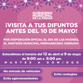 La Piedad, Michoacán a 15 de abril de 2021.- Por disposición del Gobierno Local, a partir de hoy y hasta el próximo 9 de mayo, el horario de ingreso para visita al panteón municipal “Jardines de Otoño” se amplía hasta las 5:00 de la tarde. Cabe destacar que...