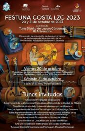 Cd. Lázaro Cárdenas, Michoacàn a 13 de Octubre del 2023.-El Gobierno Municipal invita a la población en general a disfrutar del FESTUNA Costa LZC 2023 que se realizara los días 20 y 21 de octubre en el Conjunto Habitacional Puerto Pacífico; siendo la Tuna Distrito de Lázaro Cárdenas...