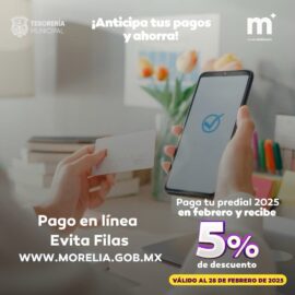 Morelia, Michoacán a 14 de Febrero de 2025.-El Gobierno de Morelia invita a la ciudadanía a aprovechar el 5 por ciento de descuento en el pago del predial durante todo el mes de febrero tanto en la zona urbana y rural, de lunes a domingo. Los pagos...