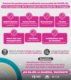 Morelia, Michoacán, a 16 de Agosto de 2021.- La Secretaría de Salud de Michoacán (SSM), habilitó siete módulos para toma de muestras COVID-19 en municipios que forman parte de la Jurisdicción Sanitaria 5 Uruapan. En caso de presentar fiebre, dificultad para respirar, dolor de cabeza u otra sintomatología...