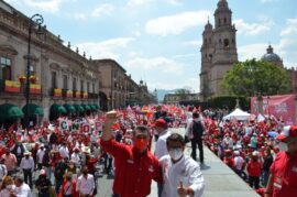 Morelia, Michoacán a 16 de mayo de 2021. Ante militantes y simpatizantes del Partido Revolucionario Institucional (PRI), concentrados en el Centro Histórico de Morelia, el presidente del Comité Directivo Estatal (CDE), Eligio González Farías, agradeció el apoyo y esfuerzo que han realizado, los cuales permitirán el triunfo en las...