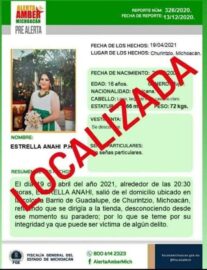 Morelia, Michoacán, a 23 de Abril de 2021.- Resultado de investigaciones, la Fiscalía General del Estado de Michoacán (FGE) aseguró a una adolescente de 16 años de edad que fue reportada como desaparecida en Churintzio. De las investigaciones se desprende que, el pasado 19 de abril, la agraviada salió...