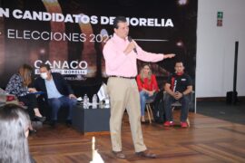 Morelia, Michoacán a 12 de mayo de 2021. .- El candidato a alcalde de Morelia, Alfonso Martínez Alcázar, presentó su plan de gobierno a empresarios de Canaco y sostuvo que la clave para el desarrollo de cualquier ciudad, es la seguridad, tema en el cual la actual administración...