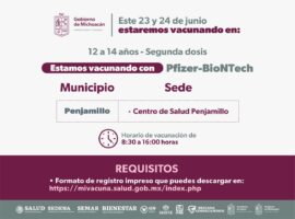 Morelia, Michoacán, a 23 de junio del 2022.- Del 23 al 24 de junio, la Secretaría de Salud de Michoacán (SSM) aplicará segundas dosis de vacuna anti COVID-19, a los adolescentes de 12 a 14 años, en el municipio de Penjamillo El centro de salud de Penjamillo, ubicado...
