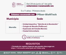 Morelia, Michoacán, a 27 de junio del 2022.- Este 28 de junio, arranca en Michoacán, la vacunación de primera dosis anti Covid-19, para niños de 5 a 11 años; los menores serán inmunizados con el biológico de Pfizer-BioNTech. Recordar que desde el pasado 16 de junio se abrió...
