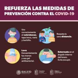 Morelia, Michoacán, 28 de junio del 2022.- Para reducir el riesgo de contagio, la Secretaría de Salud de Michoacán (SSM) exhorta a la población, a mantener las medidas básicas de prevención contra COVID-19, con el uso de cubrebocas en espacios cerrados, mantener distancia social de 1.5 metros y...