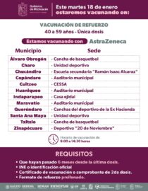 Morelia, Michoacán, 18 de enero de 2022.- Inicia hoy en 24 municipios del interior del estado la vacunación de refuerzo contra COVID-19 para personas de 40 a 59 años (única dosis AstraZeneca); mientras que en Morelia la inmunización se desarrollará del 19 al 21 de enero. Se estará...
