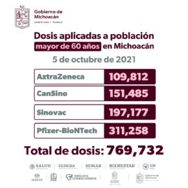 Morelia, Michoacán, 12 de octubre de 2021.- Michoacán registra un avance del 64.8 por ciento en vacunación anti COVID 19 con la aplicación de 3 millones 909 mil 188 dosis de los biológicos Cansino, AstraZeneca, Pfizer y Sinovac en beneficio de población mayor de 18 años. Al día...