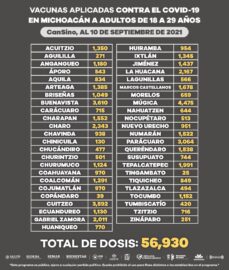 Morelia, Michoacán, a 10 de septiembre de 2021.- La población de 18 a 29 años de edad ha recibido 418 mil 161 dosis de vacuna anti COVID-19 en la entidad. De las dosis aplicadas, 49 mil 283 corresponden a AstraZeneca, 56 mil 930 a CanSino, 281 mil 087...