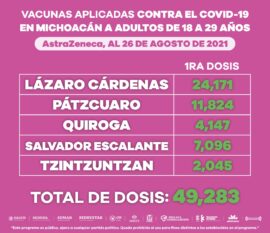 Morelia, Michoacán, a 26 de agosto de 2021.- Michoacán superó las más de 2 millones y medio de dosis de vacunas anti COVID-19 aplicadas a diversos grupos etarios, acción básica para la contención del virus. Con la aplicación de biológicos de Pfizer, AstraZeneca, Sinovac y unidosis de Cansino,...