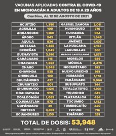 Morelia, Michoacán, a 14 de agosto de 2021.- Hasta la fecha en el estado se han aplicado 82 mil 023 dosis de vacuna anti COVID-19 a población de 18 a 29 años de edad. De las vacunas aplicadas, 54 mil 296 corresponden al biológico de CanSino que es...