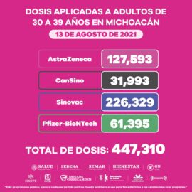 Morelia, Michoacán, a 13 de agosto de 2021.- La población de 30 a 39 años en la entidad registra una positividad del 33.41 por ciento y hasta la fecha suman un total de 18 mil 247 casos confirmados de COVID-19. A este sector le han sido aplicadas 447...