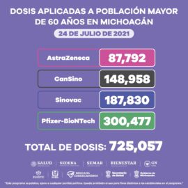 Morelia, Michoacán, a 24 de julio 2021.- Las jornadas de vacunación anti COVID-19 en Michoacán, registran la aplicación de 2 millones 28 mil 786 dosis en diversos grupos de la población. Dentro de los inmunizados se encuentran los trabajadores de la salud con 45 mil 340 dosis, docentes...