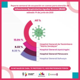 Morelia, Michoacán, a 19 de junio de 2021.- De los hospitales de la Secretaría de Salud de Michoacán (SSM) con camas reconvertidas para la atención de Infecciones Respiratorias Agudas Graves (IRAG), el de Tacámbaro registra mayor ocupación. El Hospital General «María Zendejas», se encuentra al 40 por ciento,...