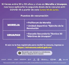 Morelia, Michoacán, a 13 de junio de 2021.- El Consejo Estatal de Vacunación (COEVA), informa que, a partir de este lunes, las y los michoacanos de 50 a 59 años que ya recibieron una dosis de inmunización contra el COVID-19, podrán recibir la segunda y, con esto, completar...