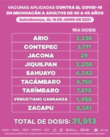 Morelia, Michoacán, a 16 de junio de 2021.- Un total de 69 mil 858 michoacanos de 40 a 49 años, pertenecientes a 27 municipios, han sido inmunizadas contra el COVID-19. Es así que a través de diversas farmacéuticas se han desarrollado las jornadas de vacunación en completo orden...