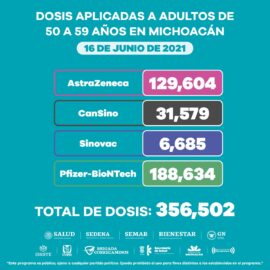Morelia, Michoacán, a 16 de junio de 2021.- Personal médicos, de enfermería y paramédico de la Secretaría de Salud de Michoacán (SSM) ha participado en la aplicación de 356 mil 502 dosis de vacunas anti COVID-19 a personas de 50 a 59 años de edad. Asimismo, también han...