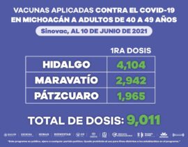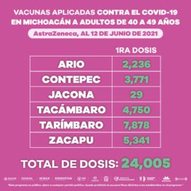 Morelia, Michoacán, a 10 de junio de 2021.- En la entidad se han aplicado 22 mil 950 dosis de la vacuna anti-COVID-19 a personas de entre 40 y 49 años de edad, informó la Secretaría de Salud de Michoacán (SSM). De las dosis aplicadas, 13 mil 219 fueron...