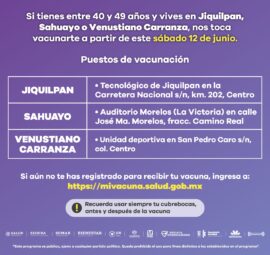 Morelia, Michoacán, a 11 de junio de 2021.- La Secretaría de Salud de Michoacán (SSM), informa que este sábado 12 y domingo 13 de junio, habrá jornada de inmunización a personas de 40 a 49 años en los municipios de Jiquilpan, Sahuayo y Venustiano Carranza. Los módulos de...