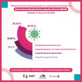 Morelia, Michoacán, a 12 de junio de 2021.- La Secretaría de Salud de Michoacán (SSM), informa que la ocupación de camas para la atención de Infecciones Respiratorias Agudas Graves (IRAG), en 4 hospitales de la institución es de 33.33 a 12.5 puntos porcentuales. El Hospital General de Pátzcuaro...