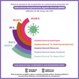 Morelia, Michoacán, a 22 de mayo de 2021.- La Secretaría de Salud de Michoacán (SSM), informa que la ocupación de camas para la atención de Infecciones Respiratorias Agudas Graves (IRAG), en 5 hospitales de la institución es de 43.48 a 12.32 puntos porcentuales. El Hospital General de Apatzingán...