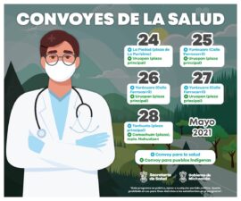 Morelia, Michoacán, a 23 de mayo de 2021.- La Secretaría de Salud de Michoacán (SSM), desplegará los Convoyes de Salud y para Pueblos Indígenas del 24 al 28 de mayo en cinco municipios. El Convoy de la Salud se instalará en la plaza de la Purísima, en La...
