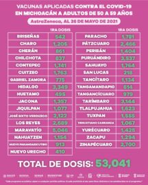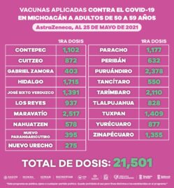 Morelia, Michoacán, a 25 de mayo 2021.- Hasta el día de hoy se han aplicado 169 mil 901 dosis de vacuna anti COVID-19, dirigida a población de 50 a 59 años, de las farmacéuticas CanSino, Pfizer y AstraZeneca, en beneficio de 34 municipios. Habitantes de los municipios de...