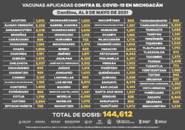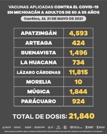Morelia, Michoacán, a 21 de mayo de 2021.- La Secretaría de Salud de Michoacán (SSM), informa que se han aplicado 117 mil 151 dosis de vacuna anti COVID-19 a personas de entre 50 a 59 años, en diferentes municipios de la entidad. Apatzingán, Arteaga, Buenavista, La Huacana, Lázaro...