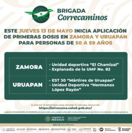 Morelia, Michoacán, a 12 de mayo de 2021.- La vacunación contra COVID-19 a personas de 50 a 59 años de edad, iniciará este jueves 13 de mayo en Zamora y Uruapan. En Zamora los módulos de vacunación se encontrarán en la Unidad deportiva El Chamizal y en la...