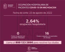 Morelia, Michoacán, 24 de agosto del 2022.- En Michoacán continúan a la baja las hospitalizaciones por infecciones respiratorias agudas graves y por Covid-19, pues la red de Infección Respiratoria Aguda Grave (IRAG) registra un 2.64 por ciento de ocupación. De acuerdo al informe diario de las instituciones que...