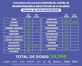 Morelia, Michoacán, a 15 de julio de 2021.- En la entidad se han aplicado 348 mil 396 dosis de la vacuna anti-COVID-19 a personas de entre 40 y 49 años de edad, informó la Secretaría de Salud de Michoacán (SSM). En este sector de la población se han...