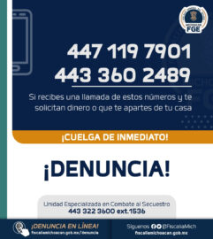 Morelia, Michoacán, a 8 de abril de 2021.- Resultado de investigaciones, la Fiscalía General del Estado de Michoacán (FGE) localizó a salvo a una adolescente de 16 años de edad, quien fue víctima de extorsión virtual en el municipio de Puruándiro. De los hechos se pudo establecer que,...