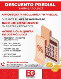 Tarímbaro, Michoacán a 24 de Octubre de 2023.- El Buen Gobierno de Tarímbaro anuncia que durante el mes de noviembre, estará disponible un descuento del 100% en multas y recargos del pago predial. Esta iniciativa tiene como objetivo principal brindar a la ciudadanía la oportunidad de ponerse al...