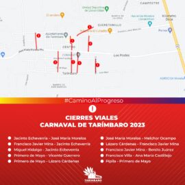 Tarímbaro, Michoacán a 17 de Febrero 2023.- El Gobierno de Tarímbaro informa a la población que, con motivo de la celebración del Carnaval que se llevará a cabo los días domingo 19, lunes 20 y martes 21 de febrero, se llevarán a cabo cierres de vialidades en la...
