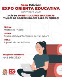 Tarímbaro, Michoacán, 11 de Abril de 2024.- El Ayuntamiento de Tarímbaro, en colaboración con la Dirección de Educación del municipio, se complace en anunciar la llegada de la Tercera Expo Orienta Educativa 2024. Este evento que está destinado a orientar a los estudiantes en sus futuras trayectorias...