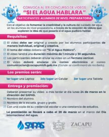 Zacapu, Michoacán, 15 de marzo de 2025.- Con la finalidad de fomentar el cuidado y uso responsable del agua, el Sapas invita a niños y jóvenes a participar en el concurso “Si el agua hablara”. Esta actividad está enfocada en promover la participación de niños de 5...