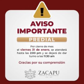 Zacapu, Michoacán, 28 de enero de 2025- Con la finalidad de mantener cuentas transparentes y organizadas, la Dirección del Predial atenderá en horario reducido el día viernes 31 de enero, informó la directora Pamela Félix León. Debido al cierre de mes, el servicio concluirá a las 2:00 pm,...