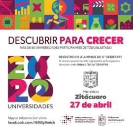 Zitácuaro, Michoacán 21 de abril de 2022.- Zitácuaro será sede de la Expo Universidades 2022, donde miles de alumnos próximos a egresar de sus estudios de nivel medio superior, tendrán la oportunidad de conocer la oferta educativa del estado y de la región. La cita será el próximo...