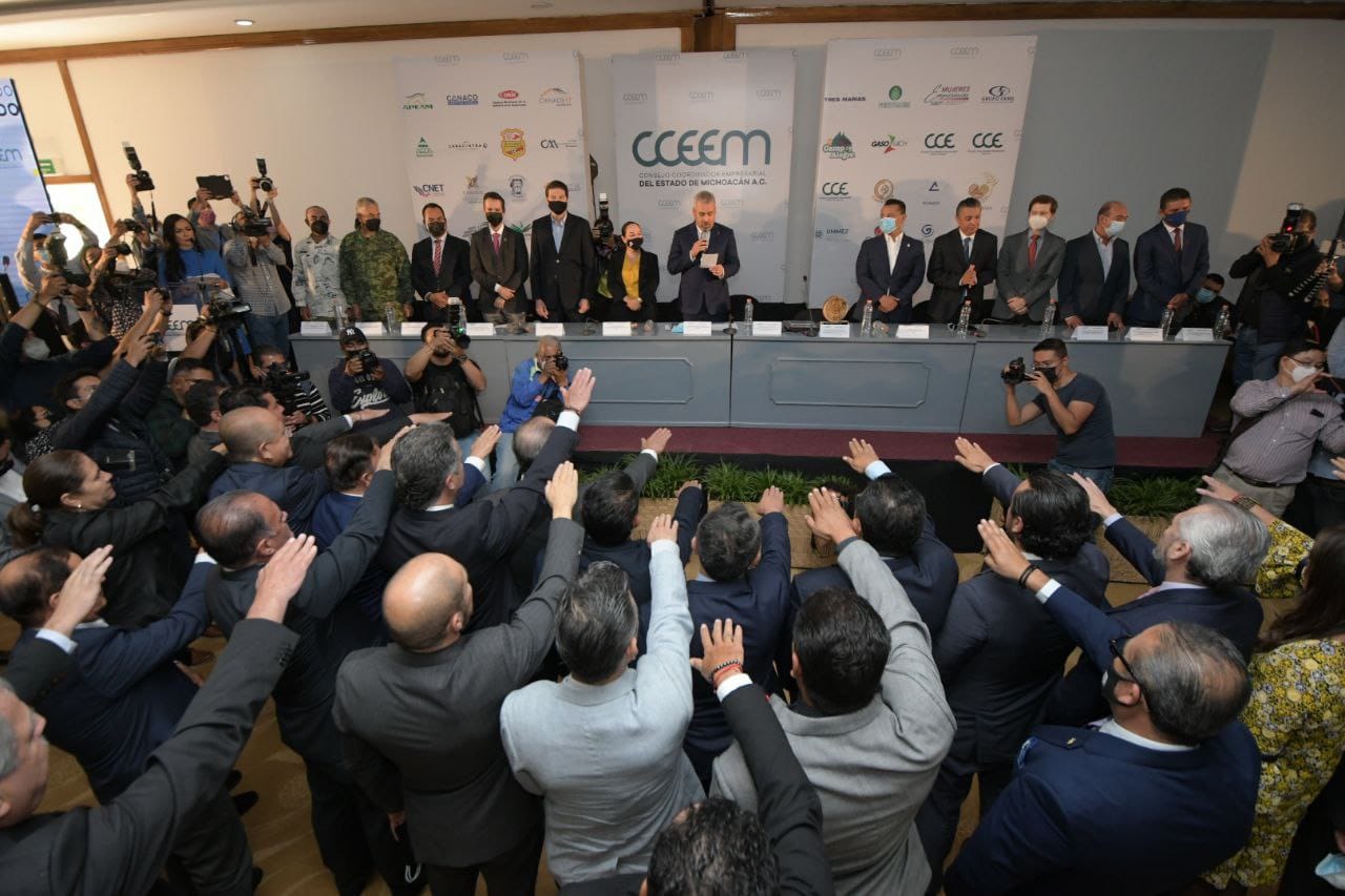 Morelia, Michoacán, 11 de noviembre del 2021.- Tras reconocer al Consejo Coordinador Empresarial del Estado De Michoacán (CCEEM) por ser parte importante de la recuperación económica que provocó la pandemia por Covid 19 en el municipio, estado y país, el presidente municipal, Alfonso Martínez Alcázar felicitó a los nuevos integrantes del consejo directivo de éste organismo empresarial.