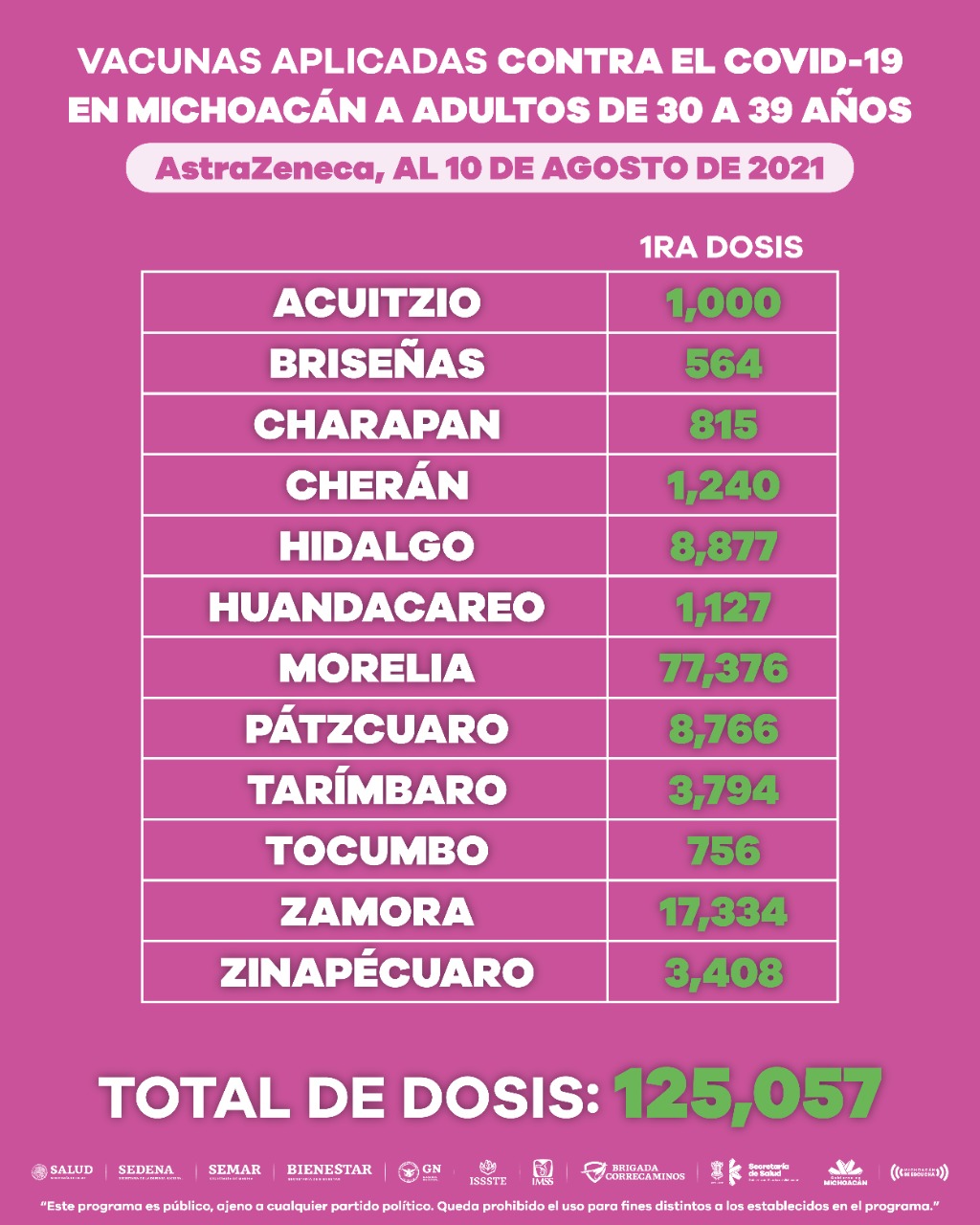 Actualmente se mantienen activos seis puestos de vacunación para este grupo poblacional, los cuales son: Escuela Melchor Ocampo, del municipio de Hidalgo; Escuela Primaria Madera, de Angamacutiro, y Escuela Secundaria Federal 18 de marzo, perteneciente a Maravatío.
