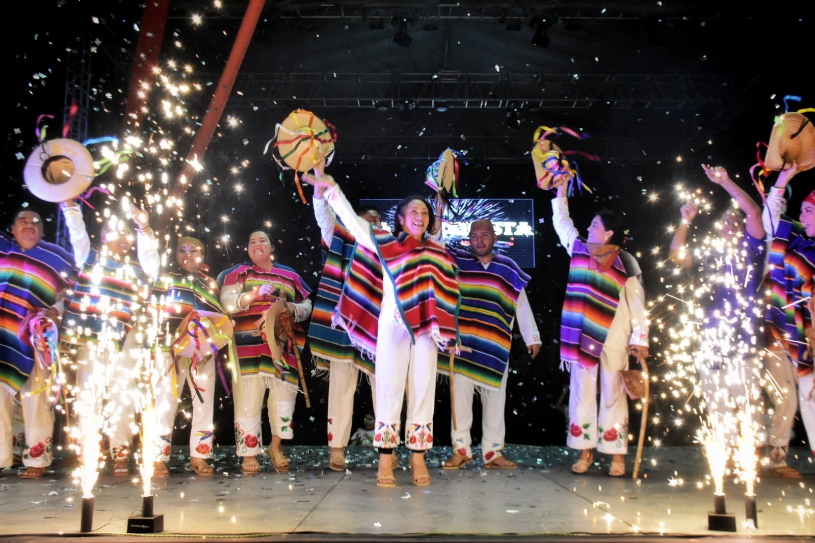 Con máscara y vestuario tradicional, la Alcaldesa salió al escenario junto con su equipo para interpretar un repertorio de bailes, los cuales dieron pasó a la convivencia con el público, quienes bailaron y aplaudieron junto con los funcionarios.